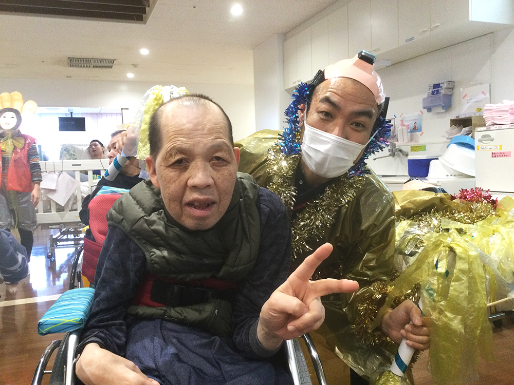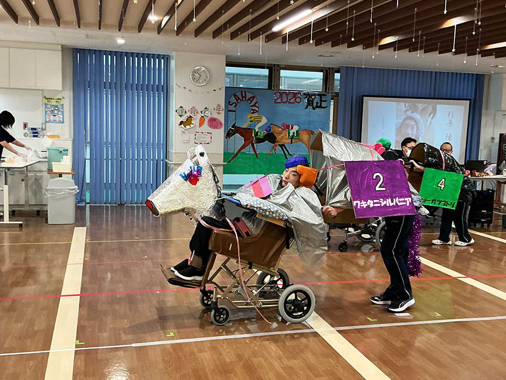 1月18日に新年を祝う会を開催しました。ひかり棟はよさこい踊り観覧、こすもす棟は新春かくし芸大会、しおさい棟は干支に因んだ競馬レース。それぞれの病棟でみんな笑顔で体を動かしながら楽しい新年を祝う会になりました。